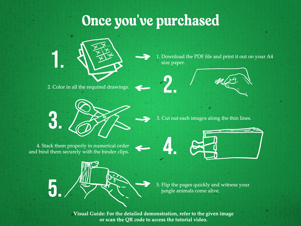 What's included: 1. 6-page downloadable PDF: High-quality illustrations of jungle animals ready to be printed and brought to life! (File size: 8.5 inches x 11 inches). *6 pages with animated frames and 2 pages for instructions. 2. Clear instructions: Easy-to-follow steps for double-sided printing, cutting, coloring, and assembling your flipbook. 3. Endless animation possibilities: Encourage your child to experiment and create their own jungle stories!